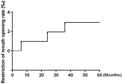 After 5 years of follow-up, five of the 104 patients enrolled in the study had died, and four patients had been lost to follow-up and were counted as deaths. Ninety-five patients were alive at the end of the observation period. The local recurrence rate was only 1.92% (2/104) (Figure 1), and the distant metastasis rate was only 2.88% (3/104) (Figure 2). The rate of titanium rejection and infection reaction leading to restriction of mouth opening was only 2.88% (3/104) (Figure 3). The 5-year post-surgery survival rate was 91.35% (95/104) (Figure 4). No patients developed facial deformities after surgery. The most important goal of the treatment regimen was to improve patient quality of life after surgery by restoring important patient functions, such as speech, eating, and swallowing.