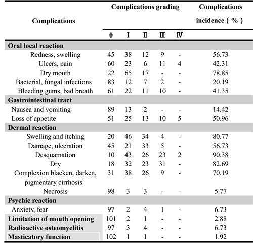All 104 patients completed preoperative chemotherapy. Of these patients, 42 had gastrointestinal reactions of different severities. For example, some patients had mild reactions characterized by nausea and vomiting within 1-2 d after paclitaxel injection that resolved without treatment. Additionally, 7 patients developed fevers, and 12 patients suffered hair loss. Additional patients developed subcutaneous nodules and experienced pigmentation changes and other reactions. No patients discontinued treatment due to renal toxicity, bone marrow growth arrest or pulmonary fibrosis (Table 2). All hematological toxicities experienced by the patients enrolled in the study were mild and reversible. The radiotherapy complications experienced by the patients are shown in Table 3.