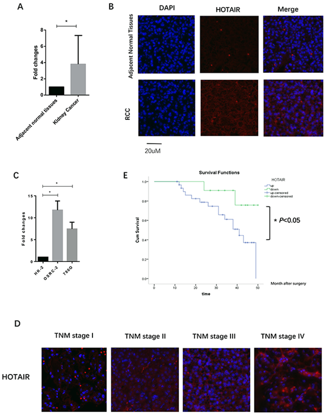 Figure 1: HOTAIR is overexpressed in renal cell carcinoma (RCC). (A and B) Elevated expression of HOTAIR was detected in RCC clinical samples by quantitative RT-PCR (A) and lncRNA FISH (B). (C) Expression of HOTAIR in RCC cell lines (786O and OSRC-2) compared with the normal kidney renal tubular epithelial cell line HK2. (D) Expression of HOTAIR was increased in high stage RCC (III and IV), as compared with stage I and II. (E) Patients with high expression of HOTAIR had a short overall survival after surgery.
