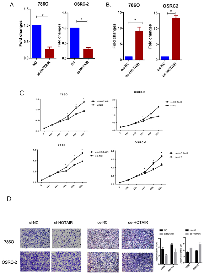 Figure 2: Knockdown and overexpression of HOTAIR affect RCC cell proliferation and migration. (A) Expression of HOTAIR was successfully knocked down. (B) Overexpression lentivirus was successfully constructed and transfected into 786O and OSRC-2 cells. (C) HOTAIR knockdown significantly suppressed RCC cell proliferation, whereas HOTAIR overexpression promoted cell proliferation. (D) Cell migration was inhibited by HOTAIR knockdown and enhanced by HOTAIR overexpression.