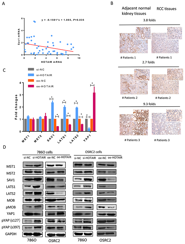 Although the involvement of HOTAIR in tumor-igenesis has been reported extensively, its role in the development and progression of RCC and the underlying mechanisms have not been clearly demonstrated. Here, we examined the prognostic value of HOTAIR in RCC and showed that altered HOTAIR expression repressed the transcription of Salvador homolog 1 (SAV1), leading to the activation of the Hippo pathway. The present study is the first to show that HOTAIR directly regulates RCC development and progression by activating the Hippo pathway.