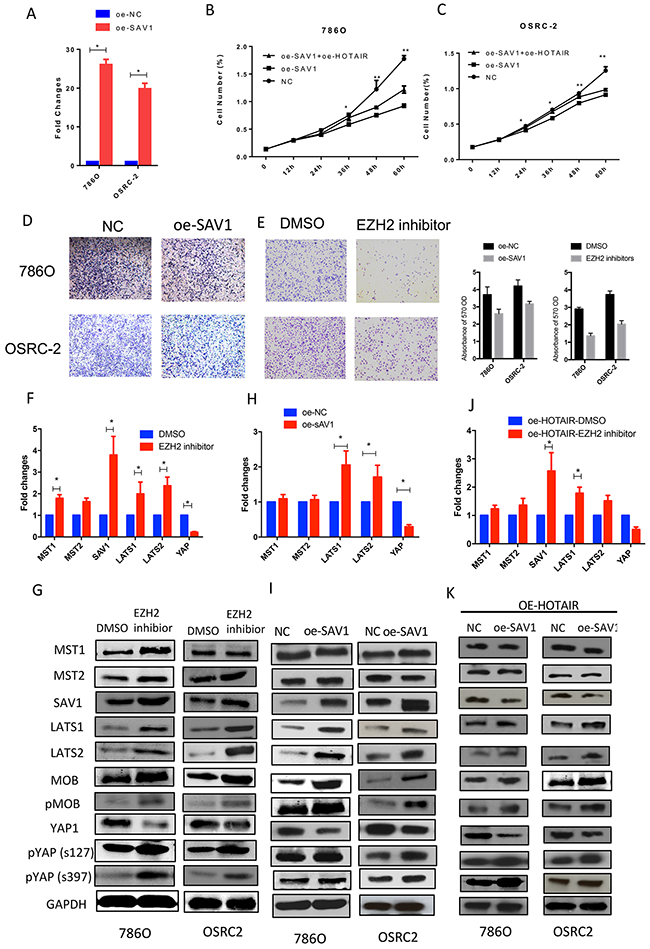 Figure 4: HOTAIR binds to SAV1 and activates the Hippo pathway. (A) Restoration of SAV1 expression in 786O and OSRC2 cells. (B and C) Restoring SAV1 expression or inhibiting EZH2 attenuated the effect of HOTAIR on promoting cell proliferation. (D and E) SAV1 overexpression inhibited the migration of 786O and OSRC2 cells, similar to treatment with GSK503. (F, G, H and I) Hippo pathway activation was reversed by restoration of SAV1 or GSK503 treatment in 786O and OSRC2 cells. (J, and K) Restoration of SAV1 and treatment with EZH2 inhibitor inactivated the Hippo pathway.