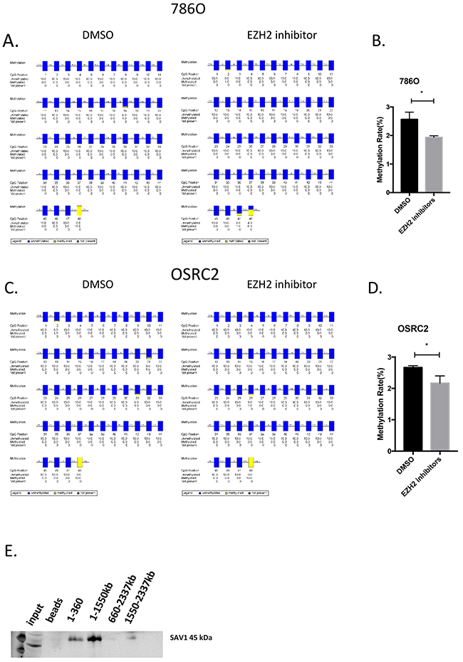 Figure 5: HOTAIR directly binds to SAV1. (A–D) Methylation status and rate of SAV1 CpG island in 786O and OSRC2 cells. (E) RNA-pulldown revealed that HOTAIR binds to SAV1.