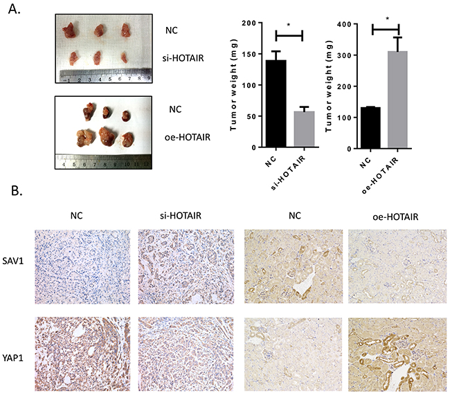 Figure 7: Tumor growth was suppressed by HOTAIR knockdown. (A) HOTAIR knockdown attenuated tumor growth in vivo. (B) After harvesting tumors, SAV1 and YAP1 were detected by immunohistochemistry in control and treated groups. The results were consistent with in vitro findings.