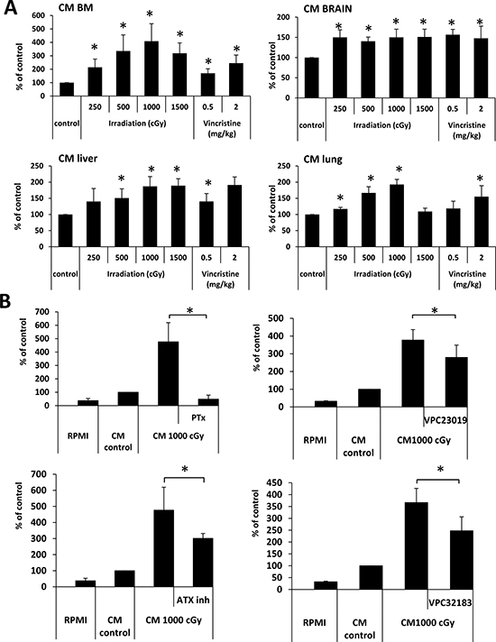 Figure 6: BphsL levels create a prometastatic microenvironment in irradiated organs. (Panel A) Conditioned media (CM) from irradiated BM, liver, and lung cells enhance the migration of A549 cell lines across Transwell membranes. The results from two independent experiments are shown as means ± SD. *p ≤ 0.05 compared with the control (CM from cells from untreated animals). (Panel B) The effect of pertussis toxin (PTx, 1 μg/ml), VPC32183 (10 μM), VPC23019 (20 μM), and the autotaxin inhibitor S32826 (ATX inh, 10 μM) on the migration of A549 cells in response to CM from irradiated BM. The results from two independent experiments are shown as means ± SD. *p ≤ 0.05 compared with the control (CM from cells from untreated animals). Migration in response to RPMI is shown as reference.