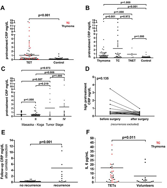Figure 1: CRP serum concentrations in TETs. CRP serum concentrations were significantly elevated in patients with TETs (n = 128) compared to controls (n = 64) (A). Separate analysis of thymomas (n = 93), TCs (n = 30) and TNETs (n = 5) compared to controls are shown (B). Highest CRP concentrations were found in metastatic TETs (Masaoka-Koga Stage IV; (C). In patients with high pretreatment CRP (≥ 0.22 mg/dL), CRP levels decreased after complete tumor resection (n = 52) (D), but increased significantly in case of tumor recurrence (n = 16) (E). IL-6 serum concentrations are significantly elevated in TETs (n = 39) compared to controls (F).