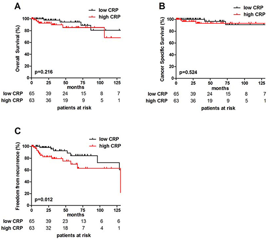 We followed the definitions of recurrence and outcome as recommended by the ITMIG [23]. To assess the prognostic value of CRP we analyzed OS, CSS and FFR. OS as the primary outcome was calculated from date of surgery to date of death of any cause. The endpoint of interest for CSS was defined as death from TET (censored observations: unrelated deaths and unknown cause of death). [23]. FFR was calculated only in patients after complete surgical resection (R0) from date of surgery to date of recurrence and full information on recurrence status [14].