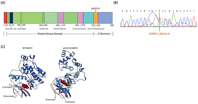 Figure 1: (A) Schematic illustration of the functional domains in human ERK2. Triangle indicates the missense mutation identified in the current study. Figure not to scale. (B) Electrophoretogram obtained from Sanger sequencing of the MAPK1 gene in the patient. The dashed line indicates the c.961G>A point mutation detected. (C) Ribbon diagrams of wild-type and mutated human ERK2 proteins depicting predicted structural changes resulting from the identified MAPK1 mutation, including alterations in the C-terminal docking (CD) domain. Structures were prepared from protein data bank file 4S31.