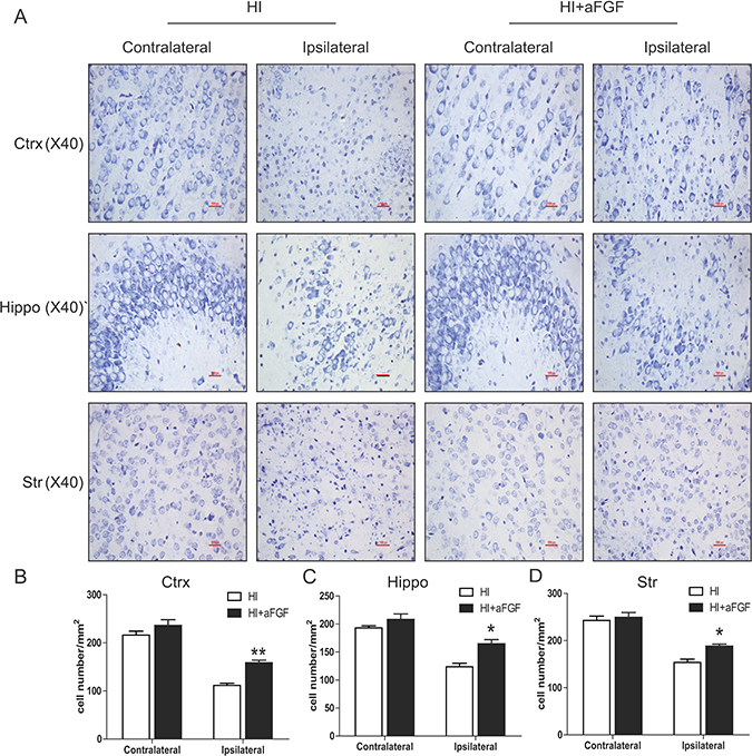 Figure 2: aFGF attenuates HI-induced neuronal cell death. Coronal brain sections were obtained from the sham, HI and aFGF-treated-group at 1 week after HI injury and stained with Nissl solution. (A) Representative pictures of the frontal cortex, dorsal hippocampus and striatum from the lesioned (ipsilateral) and unlesioned (contralateral) sides are shown. Scale bar = 100 μm. (B), (C) and (D) Analysis of Nissl data from A. *p < 0.05, **p < 0.01 versus the HI group. Data were expressed as the mean value ± SEM, n = 5 rats per group.