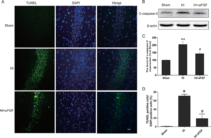 Figure 3: aFGF decreases the level of apoptosis in HI brain injury. (A) Representative TUNEL-stained (green) and DAPI-stained (blue) brain sections in the hippocampus at 1 week post-injury. Scale bar = 100 μm. (B) Detection of apoptosis proteins was performed via western blotting. The protein expression levels of cleaved caspase 3 in the brains of sham rats, HI rats and HI rats treated with aFGF. (C) Quantification of western blot data from B. **p < 0.01 versus the sham group, #p < 0.05 versus the HI group. (D) Quantitative analysis of TUNEL staining data from A. *p < 0.05 versus the sham group, #p < 0.05 versus the HI group. Data are expressed as the mean value ± SEM, n = 5 rats per group.