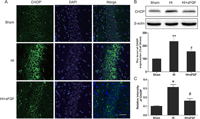 Figure 5: aFGF inhibits ER stress-related CHOP expression after HI. (A) Representative immunofluorescence staining results for CHOP (green) in the hippocampus; nuclei were labelled with DAPI (blue). Scale bar = 75 μm. (B) Representative western blots and quantification data for CHOP in the sham, HI model and HI model + aFGF treatment groups. **p < 0.01 versus the sham group, #p < 0.05 versus the HI group. (C) Quantitative analysis of immunofluorescence data from A. *p < 0.05 versus the sham group, #p < 0.05 versus the HI group. Data are expressed as the mean value ± SEM, n = 5 rats per group.