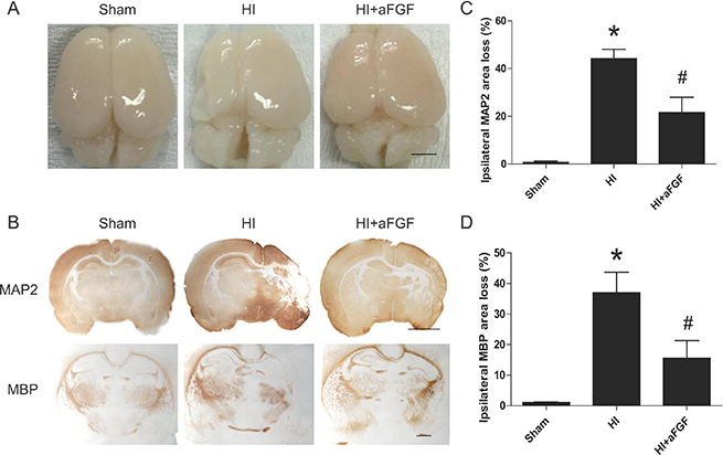 Figure 6: Long-term effects of aFGF. (A) Top view of the brains from the sham, HI and aFGF-treated-groups at 1 week after HI injury. (B) Representative sections of MAP-2 and MBP area loss. (C) Quantification of ipsilateral MAP-2 area loss. *p < 0.05 versus the sham group, #p < 0.05 versus the HI group. (D) Quantification of ipsilateral MBP area loss. *p < 0.05 versus the sham group, #p < 0.05 versus the HI group. Data are expressed as the mean value ± SEM, n = 6 rats per group.