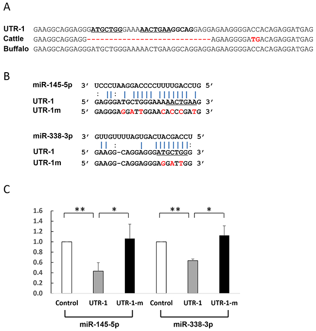 Additionally, in silico predictions are useful tools for calculating alterations of miRNA-mRNA interactions in the presence of cattle or buffalo 3′UTR sequences. In general, higher ΔΔG values indicate higher stability of miRNA-mRNA duplex. The regulatory differences between cattle and buffalo sequences were further confirmed by in vitro assays in miR-338-3p (ΔΔG=10.2 kcal/mol), miR-145-5p (ΔΔG=8.0 kcal/mol), miR-125b-5p (ΔΔG=6.8 kcal/mol), miR-331-3p (ΔΔG=4.7 kcal/mol), and miR-132-3p (ΔΔG=1.8 kcal/mol). However, in vitro confirmatory tests were not perfectly consistent with the in silico evaluation in other ten miRNAs (Figures 2 and 3), especially in miR-668-5p and miR-204-3p (Supplementary Figure 2), despite high ΔΔG values (8.1 and 7.7 kcal/mol, respectively). Additionally, no regulatory variant was detected in the confirmatory test. Therefore, we agree with the recommendation of Saba and co-authors [6] that ascertaining the true biological function of 3′UTR SNP-miRNA interactions is a critical requirement.
