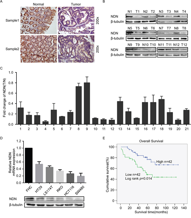 Figure 1: Expression of NDN in CRC and its correlation with CRC prognosis. (A) Immunostaining of NDN protein in CRC tissue samples and normal colorectal tissues. (B) Expression analyses of NDN protein in 12 surgical CRC tissues and the paired normal intestine epithelial samples using Western blot. β-tubulin was used as a loading control. (C) qRT-PCR analysis of NDN expression in 21 paired colorectal cancer tissues; NDN was quantified relative to the matched adjacent no tumor tissues. Error bars represent means ± SD calculated from three parallel experiments. (D) Expression analyses of NDN protein and mRNA in the normal intestinal epithelial cell FHC and five CRC cell lines through Western blot and qRT-PCR. Each bar represents the mean ± SD of three parallel replicates. (E) Influence of NDN expression on overall survival through Kaplan-Meier analysis in 84 CRC patients.