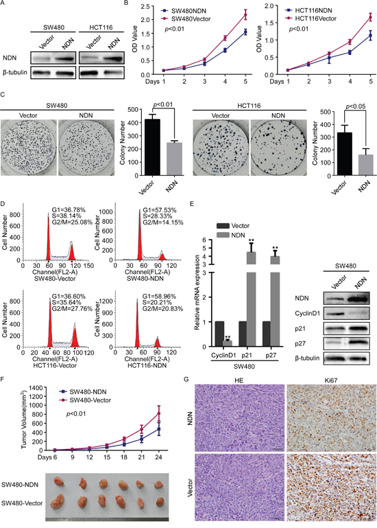 Figure 2: Overexpression of NDN attenuated CRC cell proliferation through cell cycle G1 arrest in vitro and reduces tumorigenesis in vivo. (A) Overexpression of NDN in SW480 and HCT116 cells analyzed through Western blot. β- tubulin was used as a loading control. (B and C) The over-expression of NDN inhibits SW480 and HCT29 cell proliferation in CCK8 cell proliferation assays (B) and colony formation assays (C). (D) Flow-cytometry analysis of the cell cycle in the indicated CRC cells. (E) qRT-PCR and Western blot analyses of CyclinD1, p21 and p27 in the indicated cells. (F) The xenograft models were generated after injecting SW480/Vector and SW480/NDN cells in nude mice (n = 6/group). The tumor volumes were measured on the indicated days. The data points represent the mean tumor volumes ± SD. (G) The sections of tumor were subjected to H&E staining or IHC staining using an antibody against Ki-67. Error bars represent the means ± SD from three independent experiments.