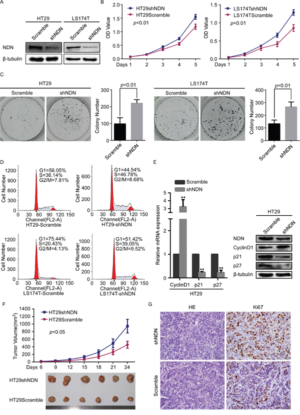 Figure 3: Depletion of NDN promotes CRC progression in vitro and in vivo. (A) Silencing of NDN in shRNA-transduced stable HT29 and LS174T cells. β- tubulin was used as a loading control. (B and C) Reduction of endogenous NDN promoted cell growth in CCK8 cell proliferation assays (B) and colony formation assays (C). (D) Flow-cytometry analysis of the cell cycle in the indicated CRC cells. (E) qRT-PCR and Western blot analyses of CyclinD1, p21 and p27 in the indicated cells. (F) The xenograft model was generated after injecting the HT29/Scramble and HT29/shNDN cells in nude mice (n = 6/group). The tumor volumes were measured on the indicated days. Data points represent the mean tumor volumes ± SD. (G) The sections of tumor were subjected to H&E staining or IHC staining using an antibody against Ki-67. Error bars represent the means ± SD from three independent experiments.