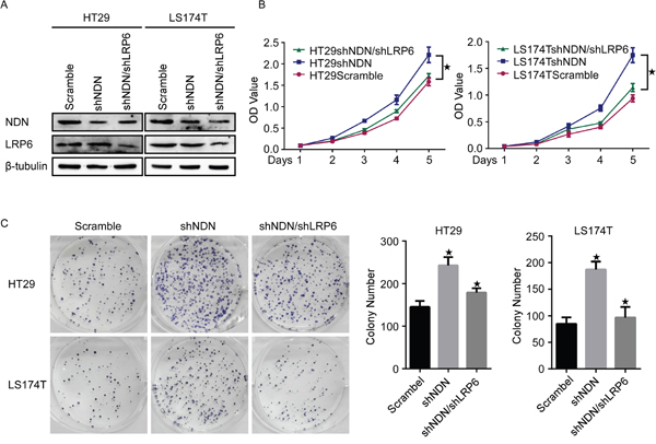 Figure 5: Inhibition of LRP6 reduces the CRC cell proliferation induced through the knockdown of NDN. (A) LRP6 was down-regulated in HT29-shNDN and LS174T-shNDN cells. (B and C) Inhibition of LRP6 suppressed the cell growth resulting from the down-regulation of NDN in CCK8 cell proliferation assays (B) and colony formation assays (C). Error bars represent the means ± SD from three independent experiments, * p<0.05.