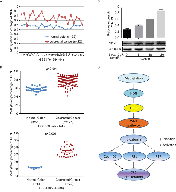 Figure 6: NDN is hypermethylated in CRC. (A and B) The results of GEO analysis of the methylation level in the promoter of NDN in CRC compared with that in the normal intestinal mucosa. (C) Treatment with a DNA demethylation agent 5-Aza-CdR increased NDN expression at different levels in the CRC cell line SW480. (D) Proposed model: promoter hypermethylation suppressed the NDN expression, however, NDN down-regulated LRP6 and attenuated the Wnt signaling pathway, and eventually suppressed the proliferation of CRC.
