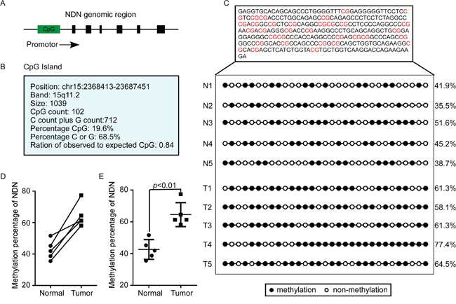 Figure 7: The NDN CpG island was hypermethylated in CRC tissues compared to the normal tissues. (A and B) The CpG island in the promoter of NDN. (C, D and E) The detection of the degree of CpG island methylation in CRC tissues.