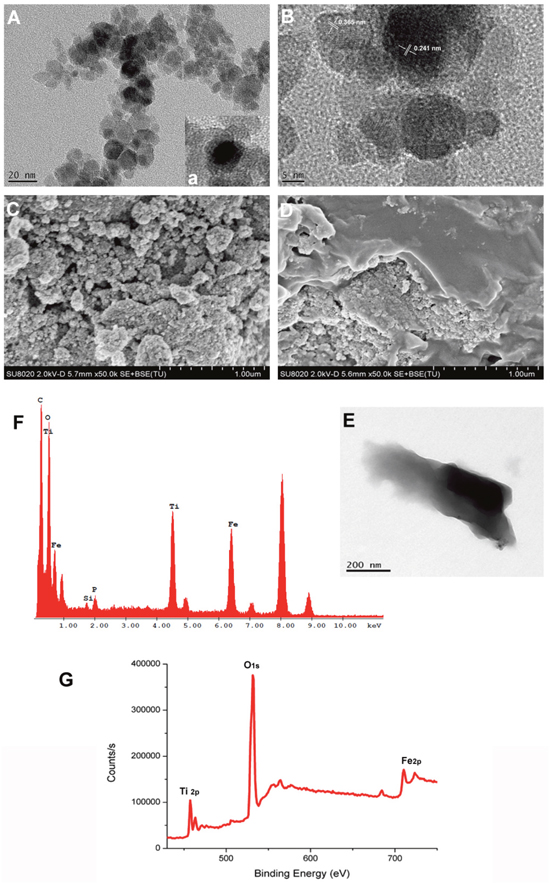 Figure 2: (A) TEM image of TiO2-IONPs; (B) High resolution TEM image of TiO2-IONPs; (C) SEM image of TiO2-IONPs; (D) SEM image of HA-TiO2-IONPs; (E) TEM image of HA-TiO2-IONPs; (F) Energy spectrum analysis of HA-TiO2-IONPs and (G) XPS test result of TiO2-IONPs.