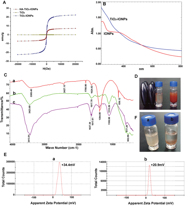 Figure 3: (A) Hysteresis curves of different nanoparticles; (B) Full spectrum scan; (C) Infrared spectrogram of a): TiO2-IONPs, b): PEI-TiO2-IONPs and c): HA-TiO2-IONPs; (D) The migration phenomenon under the magnetic field; (E) Apparent zeta potential of a): TiO2-IONPs and b): HA-TiO2-IONPs; (F) Water dispersibility of a): HA-TiO2-IONPs and b): TiO2-IONPs.