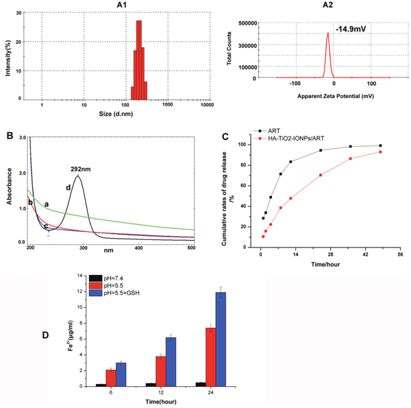 Figure 4: (A) Particle size distribution (A1) and apparent zeta potential (A2) of HA-TiO2-IONPs/ART; (B) UV-Vis spectrum of a): HA-TiO2-IONPs, b) HA-TiO2-IONPs/ART, c): HA-TiO2-IONPs after hydrolysis and d): HA-TiO2-IONPs/ART after hydrolysis; (C) Release curve of ART and HA-TiO2-IONPs/ART and (D) The amount of Fe2+ generated in different environments.