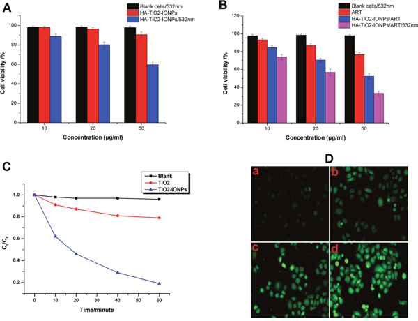 Figure 6: (A) Cell inhibition of HA-TiO2-IONPs in vitro with or without visible light irradiation; (B) Cell inhibition of ART and HA-TiO2-IONPs/ART with or without visible light irradiation; (C) Photocatalytic degradation of MB in the presence of TiO2-IONPs under visible light irradiation; (D) Intracellular ROS detection of a) control group, b) ART, c) HA-TiO2-IONPs/ART and d) HA-TiO2-IONPs/ART with visible light.