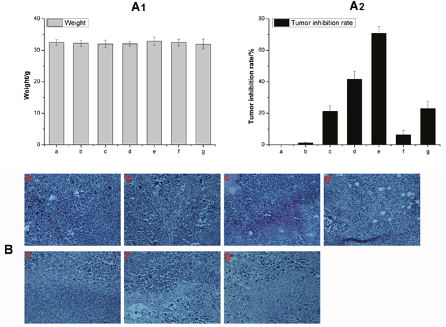 Figure 8: (A) The weight change (A1) and tumor inhibition rate (A2) of a) Control, b) Control/laser, c) ART, d) HA-TiO2-IONPs/ART, e) HA-TiO2-IONPs/ART/laser, f) HA-TiO2-IONPs and g) HA-TiO2-IONPs/laser; (B) H&E staining of tumor tissues of a) Control, b) Control/laser, c) HA-TiO2-IONPs, d) HA-TiO2-IONPs/laser, e) ART, f) HA-TiO2-IONPs/ART and g) HA-TiO2-IONPs/ART/laser.