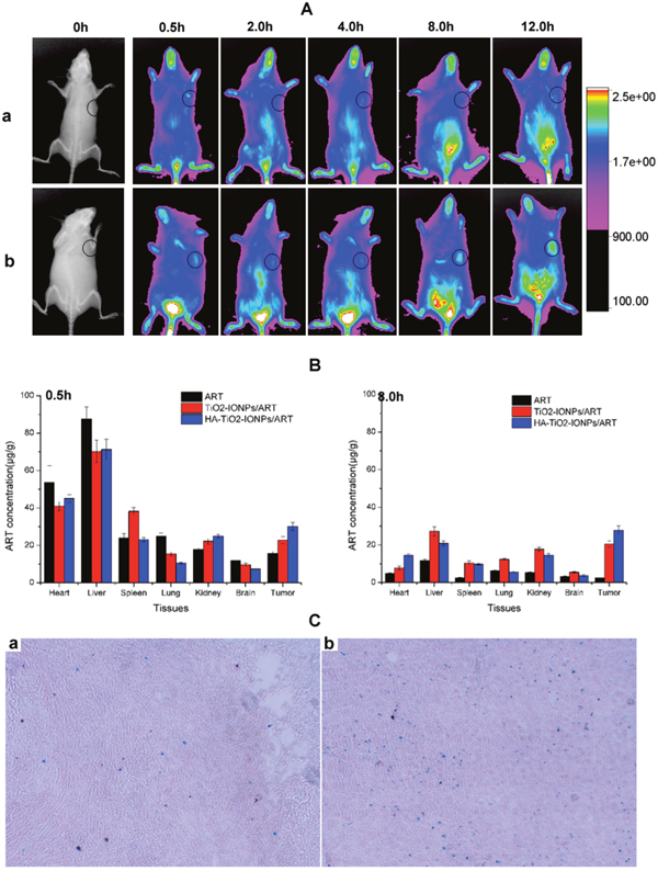 Figure 9: (A) In vivo NIR imaging of tumor-bearing mice intravenous injected with (a) free IR783 solution and (b) IR783-loaded HA-TiO2-IONPs at 0.5, 2, 4, 8 and 12h post injection; (B) Tissue distribution of ART, TiO2-IONPs/ART and HA-TiO2-IONPs/ART at 0.5h and 8h post injection; (C) The prussian blue staining images of (a) tumor tissue and (b) liver tissue for HA-TiO2-IONPs/ART group at 4h.
