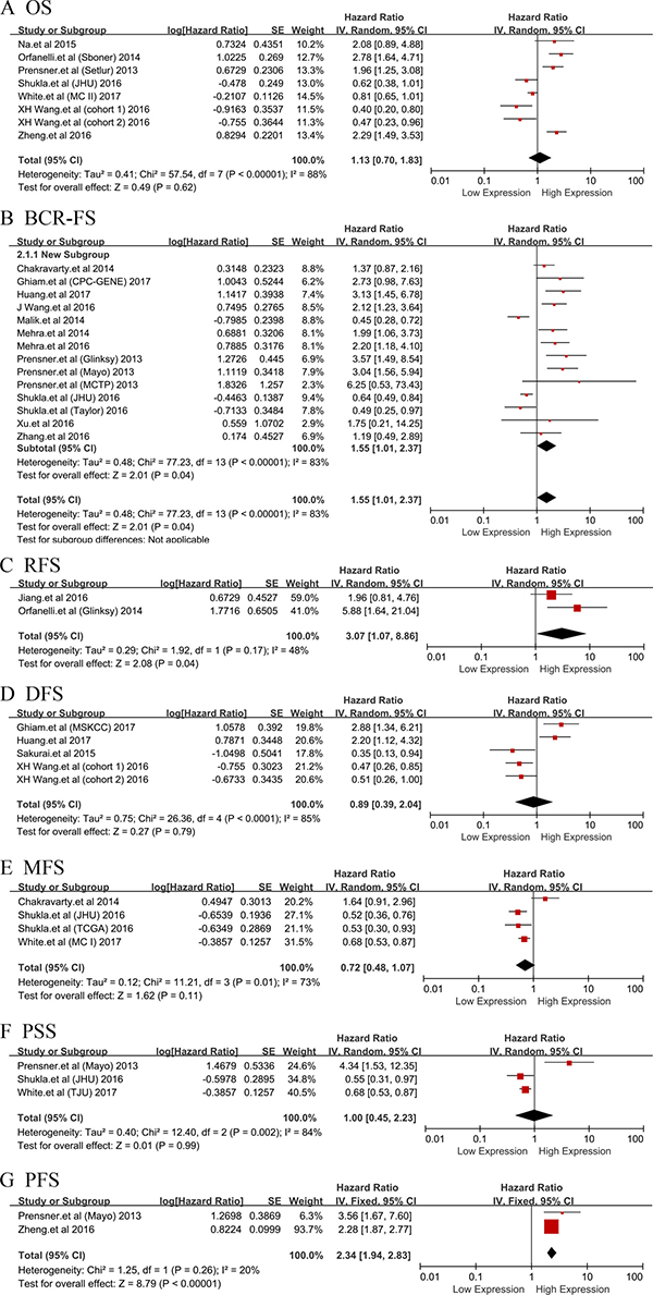 Figure 2: Forest plot of studies evaluating hazard ratios of LncRNAs expression and prognosis in PCa. The point estimate is bounded by a 95% confidence interval, and the perpendicular line represents no increased risk for the outcome. OS: overall survival; BCR-FS: biochemical recurrence-free survival; RFS: recurrence free survival; DFS: disease-free survival; MFS: metastasis free survival; PSS: prostate cancer specific survival; PFS: progression free survival.
