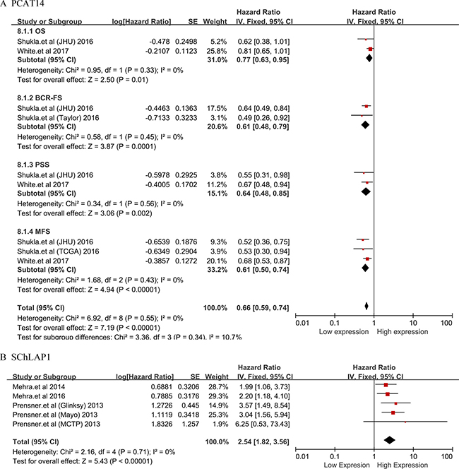 Subsequently, PCAT14 and SChLAP1 which were performed no less than two studies were included into meta-analysis on the relationship between the expression level and the prognosis of patients with PCa, respectively. We found that all the heterogeneities were not significant (I2 = 0.0%, P > 0.05) (Figure 3). Thus, we applied the fixed effects model to conduct the analysis. We found that the down-regulated PCAT14 level was associated with a poor OS (HR = 0.77, 95% CI = 0.63 to 0.95, P = 0.01), BCR-FS (HR = 0.61, 95% CI = 0.48 to 0.79, P = 0.0001), PSS (HR = 0.64, 95% CI = 0.48 to 0.85, P = 0.002) and MFS (HR = 0.61, 95% CI = 0.50 to 0.74, P < 0.00001) (Figure 3A). While, the increased SChLAP1 expression could implied the worse BCR-FS (HR = 2.54, 95% CI = 1.82 to 3.56, P < 0.00001) (Figure 3B).