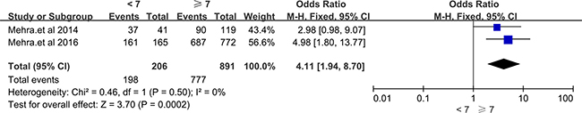 Figure 4: Forest plots of studies evaluating odds ratios (ORs) of up-regulated SChLAP1 expression and Gleason Score(< 7 vs ≥ 7) of PCa patients.