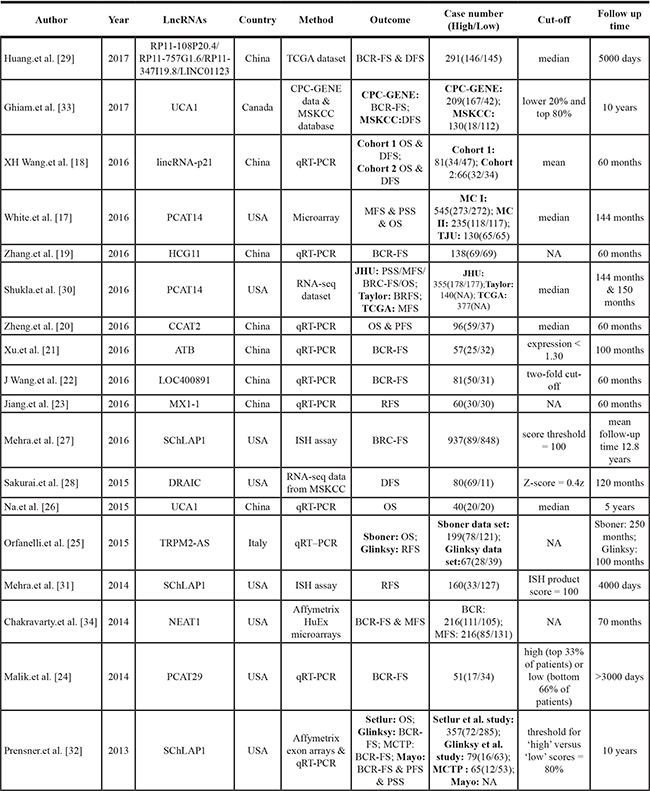 We searched databases like PubMed and Web of Science for studies published in English up to February 17, 2017. The following keywords were used “Long noncoding RNA” or “Long intergenic non-coding RNA” or “lncRNA” or “LincRNA” and “prostate cancer” or “PCa” with the limit to human.