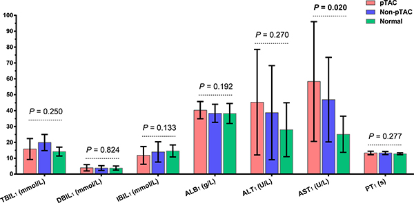 Figure 2: Liver function results on admission for patients in the pTAC, non-pTAC, and control groups. P > 0.05 for AST1 in pTAC group versus non-pTAC group (Mean ± SD).