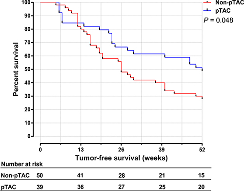 Figure 3: Tumor-free survival time for HCC patients in the pTAC and non-pTAC groups.