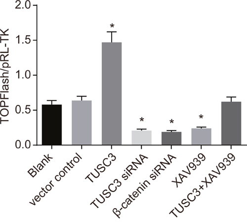 Figure 5: Analysis of Wnt/β-catenin signaling pathway activity in the blank, vector control, TUSC3, TUSC3 siRNA, β-catenin siRNA, XAV939, and TUSC3 + XAV939 groups using TOP/FOP-Flash reporter assays. *, P < 0.05 compared to the blank group; TUSC3, tumor suppressor candidate 3.