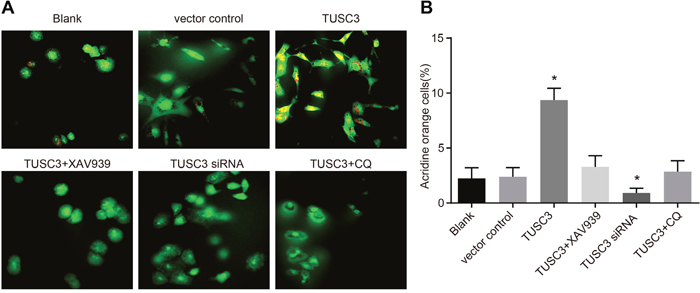 Figure 8: Cell autophagy in the blank, vector control, TUSC3, TUSC3 + XAV939, TUSC3 siRNA, and TUSC3 + CQ groups detected by acridine orange staining. (A) Acridine orange staining of A549 cells in the six groups; (B) comparison of the cell autophagy ratio among the six groups; *, P < 0.05 compared to the blank and vector control groups; TUSC3, tumor suppressor candidate 3; CQ, inhibitor chloroquine.