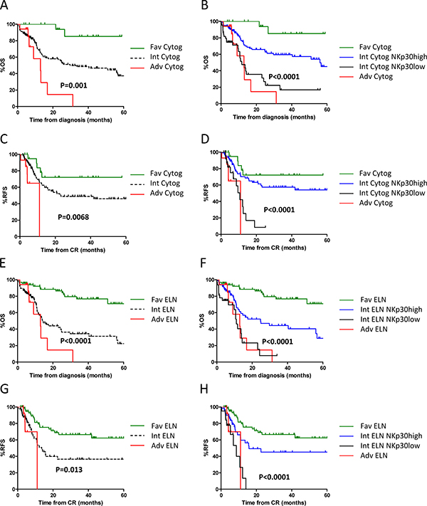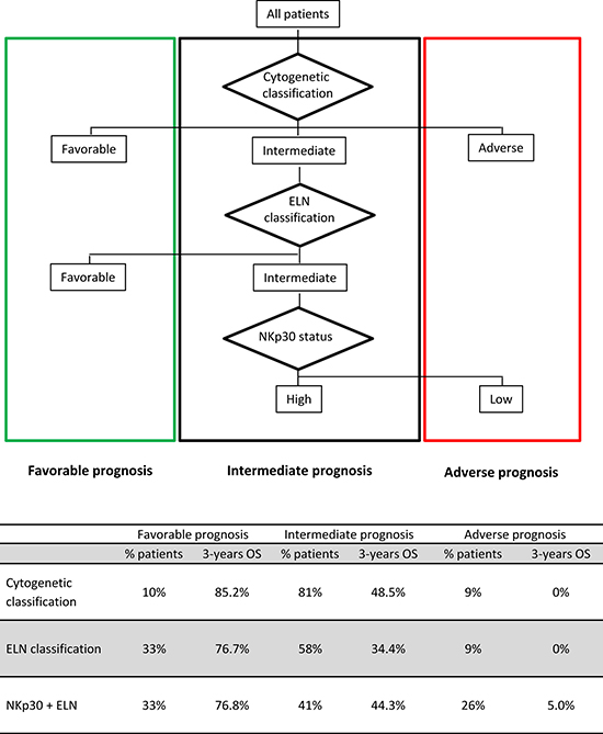 In our cohort, the prognostic value of NKp30 was significant in both OS and RFS in the group of 162 patients with intermediate cytogenetics. To date, most studies aiming at stratifying patients with AML, have focused on molecular genetic lesions, and significantly improved AML patient stratification [46–51]. Some markers such as FLT3-ITD, CEBPα and NPM1 [3, 5, 6, 49] are already used in clinical practice, and additional markers have been recently included in recommendations for prognostication. We assessed the prognostic significance of NKp30 in patients with intermediate ELN. We demonstrated that patients with intermediate ELN were still significantly stratified by NKp30 expression, with improved discrimination evidenced by an increase of the c-index compared to the cytogenetic and ELN classifications. In addition, we show that NKp30 is an independent predictor of clinical outcome in multivariate regression analyses even when accounting for the potential effects of allogeneic SCT, with a strong correlation between NKp30 status and RFS, OS and CIR.