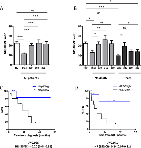 An important question remains the best time point to evaluate NKp30 expression. To date, all studies assessing the prognostic value of NKp30 were performed at diagnosis. However, major variations of NKp30 expression have been described after induction chemotherapy [18, 60]. In the present study, NKp30 expression recovery after complete remission significantly stratifies patients with poor clinical outcome. Thus, NKp30 status appears as a relevant surrogate marker to monitor after complete remission.