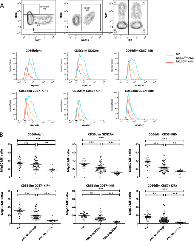 However, the mechanisms leading to low NKp30 expression in AML are not fully understood. In the present study, the low NKp30 expression observed in a fraction of patients is present at all maturation stages, with the extreme CD56bright versus CD56dim KIR+CD57+ NK cell population. As previously shown, CD57+ NK cells in HV display lower levels of NKp30 [58] compared to immature NK cells, and in AML patients we observed a lower expression in CD57+ NK cells in both group of patients (NKp30high and NKp30low). These data suggests that NKp30 low expression in NKp30low AML patient group is unlinked to NK cell maturation.