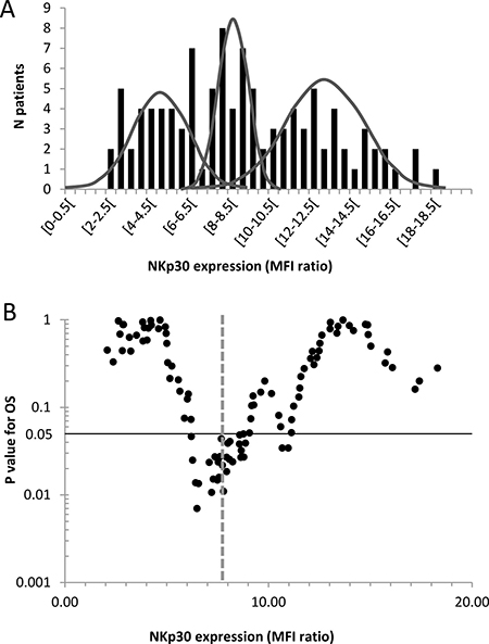 Figure 5: Threshold determination for NKp30 expression on NK cells (IPC prospective cohort). (A) Distribution histograms of NKp30 mean fluorescence intensity (MFI) ratio (NKp30 MFI / isotype control MFI) in patients with AML at diagnosis. The curves are estimates of population density distribution. (B) The volcano plot shows log of P value for overall survival according to threshold for NKp30 expression at diagnosis. The dashed line represents the threshold used in the rest of the study. The black line represents the limit of statistical significance (P < 0.05). The normality of distributions were evaluated with a d’Agostino-Pearson normality test and a Kernel density estimation.