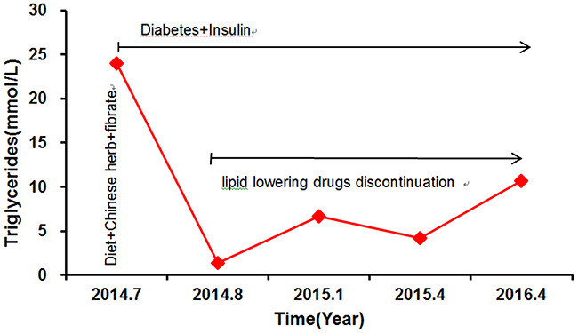 The proband MJH’s response to treatment with lipid-lowering medications between 2014 and 2016 was illustrated in Figure 1. Plasma TG showed large fluctuations during that period. He exhibited extremely high concentrations of fasting triglyceride (23.97 mmol/L) on the occasion of our first evaluation, which was 12 times higher than the upper normal range. The levels of total cholesterol (TC), low-density lipoprotein (LDL-C), and high-density lipoprotein (HDL-C) were 8.30 mmol/L, 5.64 mmol/L, and 0.75 mmol/L (Table 1), respectively. After hospitalized, he was subjected to stringent low-fat diet, Chinese herb, and Fenofibrate (100 mg three times a day), as well as intensive insulin therapy (Aspart 12 IU was administrated three times a day before each meal, Glargine 20 IU was administrated before sleep), to achieve glucose and lipid metabolism balance (Figure 1). Upon administration of lipid-lowering medications, he exhibited a much-improved lipid profile with TG level as low as 1.33 mmol/L (Figure 1). Due to the lack of symptoms, he was refractory to stick to low-fat diet and antihyperlipidemic treatment. In consequence, he presented with a subsequent relapse of hypertriglyceridemia (TG: 6.67 mmol/L) combined with relatively low LDL (2.34 mmol/L) and HDL (0.8 mmol/L) six month after being discharged from hospital (Figure 1). Since then, his TG levels displayed a stepwise increased tendency because of discontinuation of antihyperlipidemic drugs. The following two evaluations of TG levels were 4.16 mmol/L and 10.65 mmol/L, respectively (Figure 1).