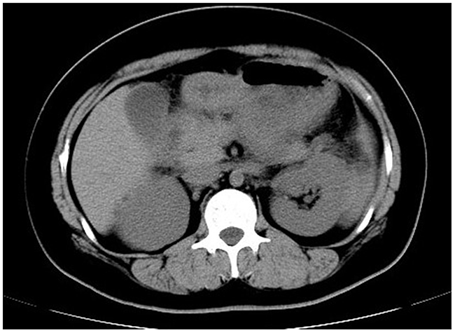 Figure 2: Abdominal computed tomography. A typical computed tomography manifestation of enlarged pancreas with blurred outline, disappearance of peripancreatic space and thickened left renal fascia was highly suggestive of acute pancreatitis.