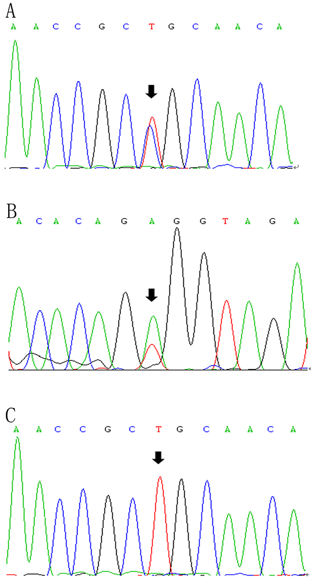 Figure 3: LPL gene (reference sequence NM_000237)sequencing diagram. The diagram showed the partial forward sequence of exon 6 in the proband (A), a control subject (C) and reverse sequence of exon 8 in the proband’s niece (B).
