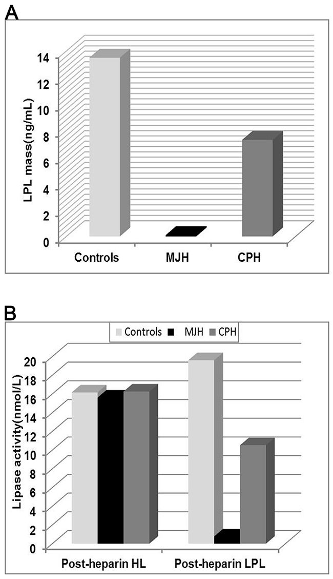 Figure 4: Analysis of LPL activity and mass in plasma. The post-heparin LPL mass (A) and lipase activity (B) was measured in the proband MJH, CPH (I-1) and 10 normolipidemic subjects. Peripheral blood was collected at 10 min after heparin injection (60IU/kg) to assay lipase activity and LPL mass by enzyme-fluorescent method and ELISA, respectively. The data of controls were presented as mean.