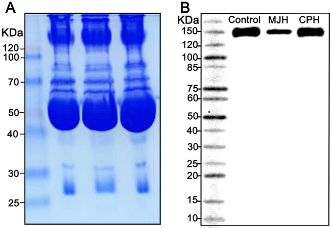 Figure 5: A native gel western blot analysis of LPL dimerization in post-heparin plasma. Coomassie staining was used as a loading control (A). Post-heparin plasma of the proband MJH, CPH(I-1), and a normolipidemic control was analyzed by a native gel western blot (B).