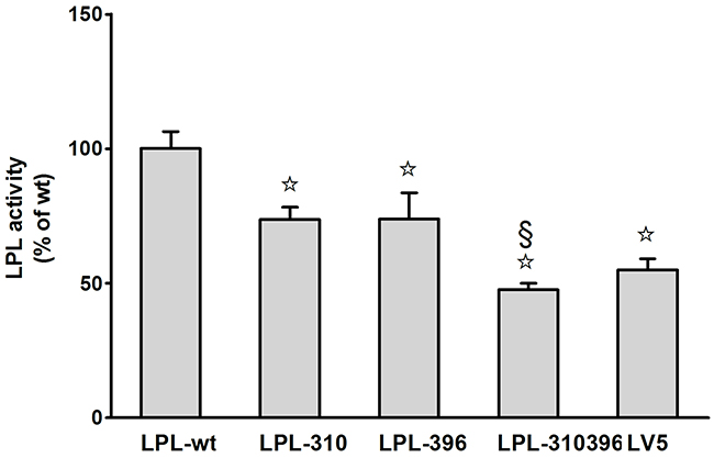 Figure 7: Functional analysis of LPL mutants in the medium. Activity of LPL mutants was assayed as a percentage of LPL wild-type after transfection. Each experiment was repeated by measuring six separate dishes. Values represent the mean ±SEM.☆and §, significant (P<0.05) differences from LPL-wt, LPL-310, respectively.