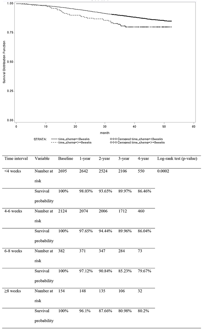 The delayed commencement of chemotherapy did not compromise survival in some studies [6, 8, 9, 12, 13, 18]; however, in other studies, a delay negatively influenced survival [5, 7, 10, 11, 14-17, 19]. In this study, using 2-week time intervals, 3-year overall survival rates showed a gradual decreasing pattern according to time delay (89.97%, 89.96%, 85.23%, and 80.98% in the <4 weeks, 4-6 weeks, 6-8 weeks, and ≥8 weeks groups, respectively). Using an 8-week cutoff, delayed chemotherapy (≥8 weeks) compromised 3-year overall survival rates (80.98%) compared with timely administration (89.62% in the <8 weeks group). The delayed initiation of chemotherapy was an independent prognostic factor for adverse overall survival.
