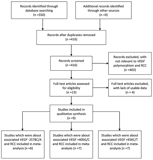 Recently, a series of case-control studies focusing on the associations between gene mutations (particularly SNPs) and the risk of RCC have been extensively studied [18-21]. However the results have been inconsistent. We conducted the present systematic review and meta-analysis to better understand the effects of VEGF rs2010963, rs3025039 and rs699947 polymorphisms on RCC susceptibility.