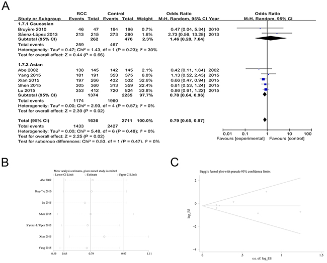 Figure 4: The association of rs699947 polymorphism with RCC susceptibility in the A allele vs. C allele model. (A) ORs and 95%CIs. (B) Sensitivity analysis. (C) Publication bias.